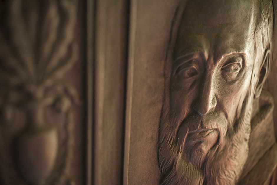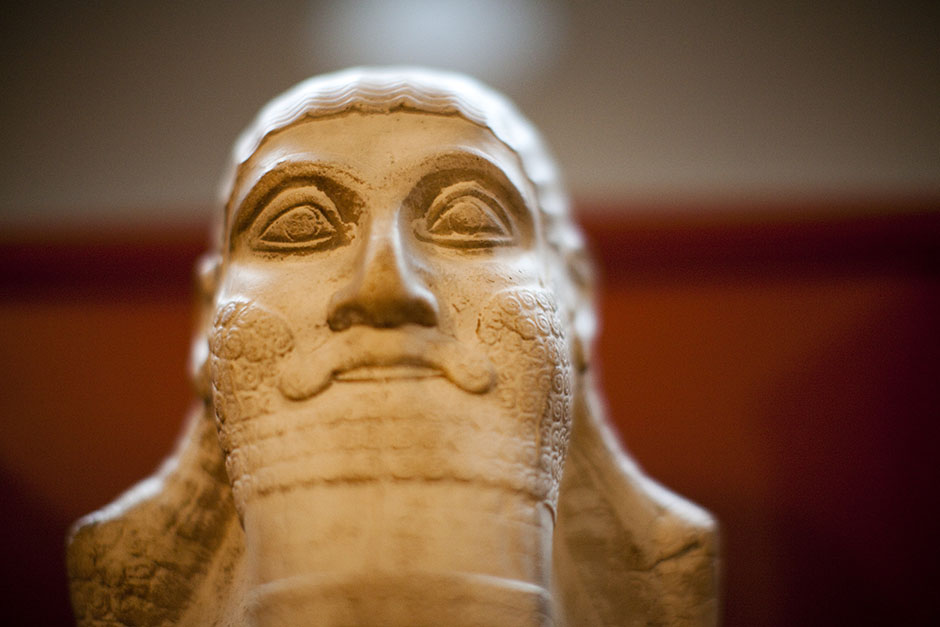 A haunting and stately carved face collects majestic light inside the Semitic Museum. Stephanie Mitchell/Harvard Staff Photographer