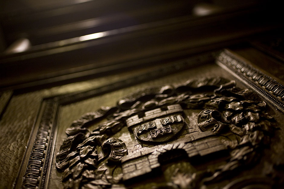 “H” is for handsome. In the right light, this embossed Harvard shield glistens inside Robinson Hall. Stephanie Mitchell/Harvard Staff Photographer