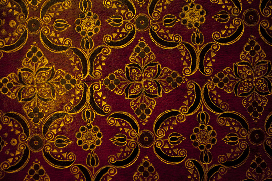 A volume intricately decorated in crimson and gold is on display in Houghton Library. Stephanie Mitchell/Harvard Staff Photographer