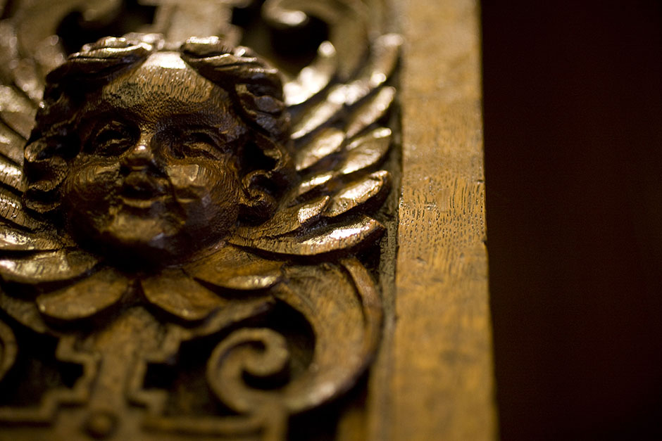 A cherubic figure adorns a grandfather clock in the Thompson Room of the Barker Center. Stephanie Mitchell/Harvard Staff Photographer