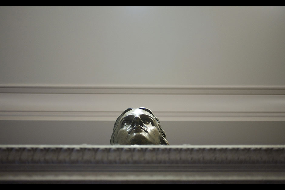A head above. Here, John Harvard gazes over the Thompson Room fireplace in the Barker Center. Stephanie Mitchell/Harvard Staff Photographer