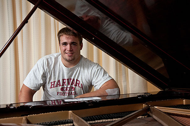 Despite weighing in at a hefty 280 pounds, Chris LeRoy ’11, starting center on the Harvard football team, has a delicate touch when he’s playing the music of Billy Joel or Ray Charles on the piano. Jon Chase/Harvard Staff photographer