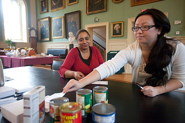 FAS staff members Michelle Taylor Hampton (left) and Maura Rizzuto participate in the first Giving Thanks Open House, a three-day event that will allow FAS employees to appreciate one another and contribute to the Harvard Square Homeless Shelter.
