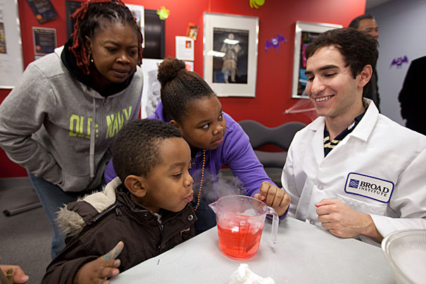 And at another stand, Brandon Silverman ’12, dressed in a Broad Institute jacket — as a mad scientist — was showing a group of kids some chemistry tricks. Dry ice emitted smoke from a beaker, and there was a “mystery box” where kids could reach in and pull out creepy objects. Daring kids even played with “gloop,” a mixture of Borax and water that transformed, with some kneading, into a solid.