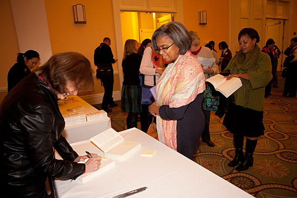 Ellen Galinsky (left) signs her book for Cynthia Jacobs-Tolbert, assistant principal of John Marshall Elementary School in Dorchester.