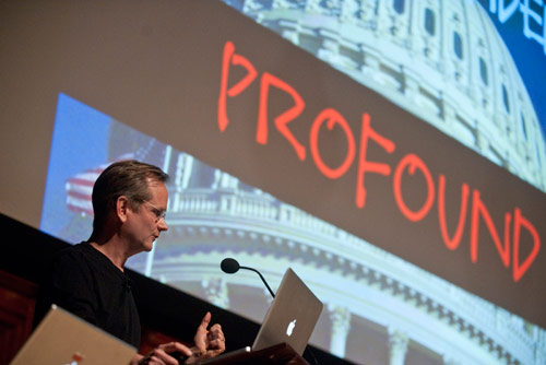 Professor of Law Lawrence Lessig discussed his fears for the future of American democracy. He worried that members of Congress are neglecting their constituents, spending too much time raising money for re-election. In the words of President Franklin D. Roosevelt, he told the crowd, we have to “convince a reluctant nation to wage a war to save democracy.”