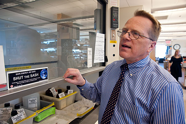 Allen Hebert, HMS energy specialist, demonstrates the “Shut the Sash” in a lab at the New Research Building.