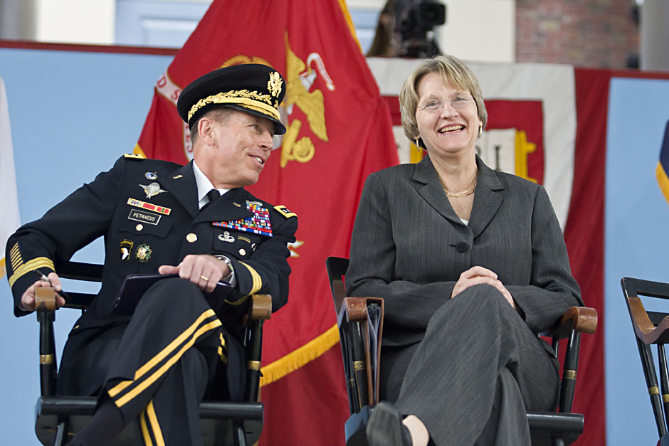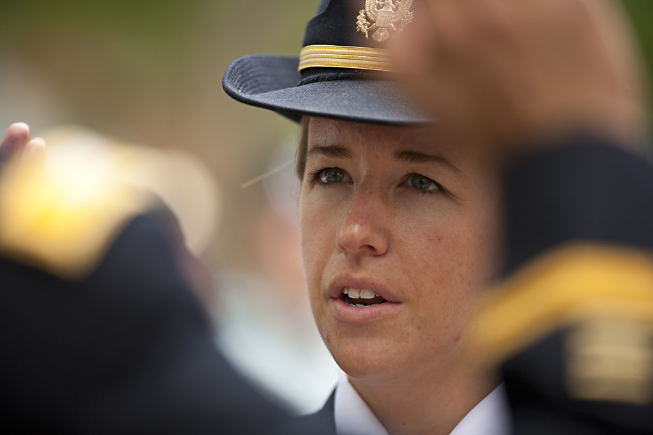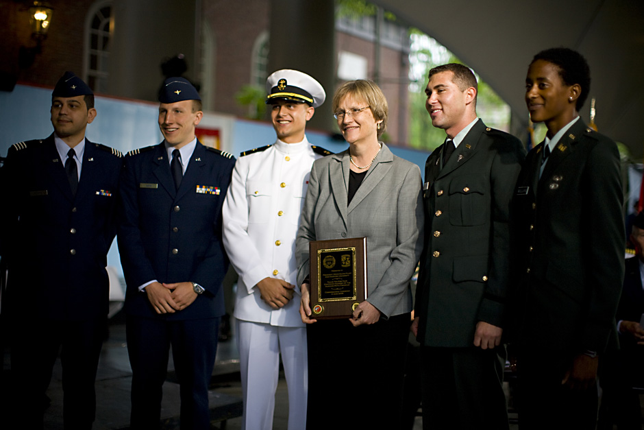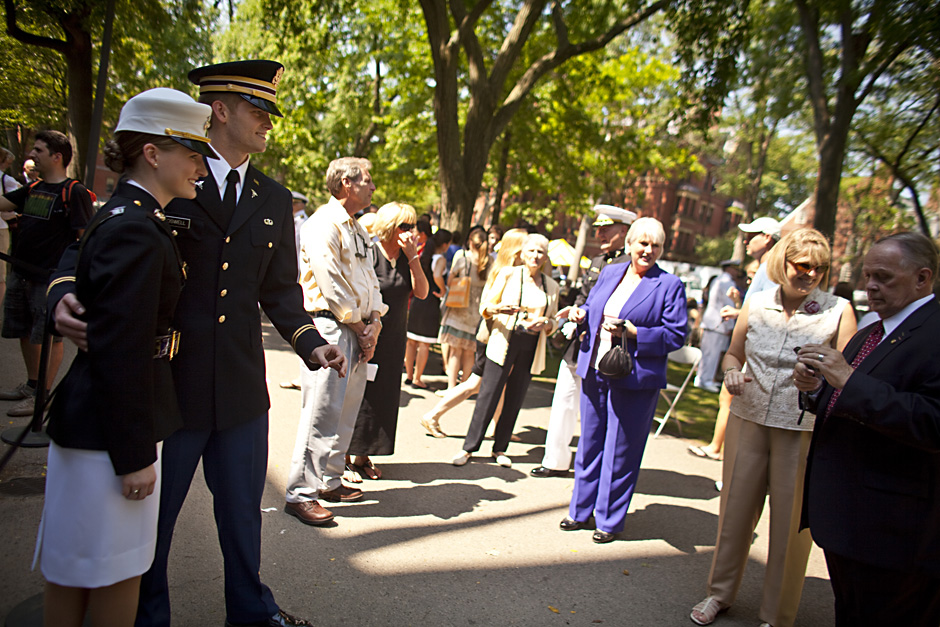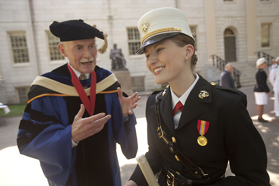 The ROTC Handbook for Harvard University in 1942. Stephanie Mitchell/Harvard Staff Photographer Harvard University Archives image. Inscription reads, “Reserve Officers Training Corps, Harvard University, Memorial Day, May 30, 1917.” Stephanie Mitchell/Harvard Staff Photographer Harvard University Archives image. Inscription reads, “Company F, Harvard ROTC 1918.” Stephanie Mitchell/Harvard Staff Photographer Harvard University Archives image. Inscription reads, “Navy, L to R, Ensigns E. Schwerin, Norma Meyer, Olga Quadland, and Edith Paulsen, Engineering 263-5 Course at Pierce Hall, October 23, 1943.” Stephanie Mitchell/Harvard Staff Photographer Copy image of historical material gathered from Harvard University Archives regarding the university’s history with ROTC. Inscription on image verso reads, Navy, L to R, Ensigns E. Schwerin, Norma Meyer, Olga Quadland, and Edith Paulsen, Engineering 263-5 Course at Pierce Hall, October 23, 1943. Stephanie Mitchell/Harvard Staff Photographer Copy image of historical material gathered from Harvard University Archives regarding the university’s history with ROTC. The image inscription reads, Bayonet Drill, Harvard ROTC at Stadium, 1917-1918. Stephanie Mitchell/Harvard Staff Photographer Harvard University Archives image. Inscription reads, “Setting up exercises, Harvard ROTC, Soldiers Field 1917-1918.” Stephanie Mitchell/Harvard Staff Photographer Harvard University Archives image. Inscription reads, “1917.” Stephanie Mitchell/Harvard Staff Photographer Copy image of historical material gathered from Harvard University Archives regarding the university’s history with ROTC. The image inscription verso reads, ROTC 1917-1918. Stephanie Mitchell/Harvard Staff Photographer Harvard University Archives image. Inscription reads, “Army, July 1943.” Stephanie Mitchell/Harvard Staff Photographer Harvard University Archives image. Inscription reads, “Mil Sci Review on steps on Widener, May 1941, WWII.” Stephanie Mitchell/Harvard Staff Photographer Copy image of historical material gathered from Harvard University Archives regarding the university’s history with ROTC. The image inscription verso reads, ROTC, Pres. Pusy, 1953. Stephanie Mitchell/Harvard Staff Photographer Copy image of historical material gathered from Harvard University Archives regarding the university’s history with ROTC. The image inscription verso reads, Reviewing ROTC parade at Harvard University are (left to right): Lt. Col Trevor H. Dupuy, Senior Professor of Military Science and Tactics of Harvard University; President Nathan M Pusey of Harvard University; Colonel Henry J.P. Harding, Chief Massachusetts Military District; Colonel Frank M. Foley, Senior Army Advisor Massachusetts Military District and Major Henry P. Walker, Professor of Military Science and Tactics at Harvard University. November 6, 1953. Credit: U.S. Army Photograph. Stephanie Mitchell/Harvard Staff Photographer Harvard University Archives image. Inscription reads, “Navy, steps of University Hall, October 9, 1943.” Stephanie Mitchell/Harvard Staff Photographer Copy image of historical material gathered from Harvard University Archives regarding the university’s history with ROTC. The image inscription verso reads, Navy ROTC, receiving tetanus inoculations, Sept. 18, 1943. Stephanie Mitchell/Harvard Staff Photographer David Boswell ’10 (left) has camo paint applied by a squad member as they ready for training early in the monring. Members of the Paul Revere Battalion Army ROTC program, including students from Harvard University, participated in the annual spring week end training exercise at Fort Devens in April 2008. Called “FTX,” it is training exercise for students held twice a year. Justin Ide/Harvard Staff Photographer David Boswell ’10 (left) comes into position during training. Members of the Paul Revere Battalion Army ROTC program, including students from Harvard University, participated in the annual spring week end training exercise at Fort Devens in April 2008. Called “FTX,” it is training exercise for students held twice a year. Justin Ide/Harvard Staff Photographer Karl Kmiecik ’10, his glasses repaired with OD Duck Tape, after a long day of training. Members of the Paul Revere Battalion Army ROTC program, including students from Harvard University, participated in the annual spring week end training exercise at Fort Devens in April 2008. Called “FTX,” it is training exercise for students held twice a year. Justin Ide/Harvard Staff Photographer Vinnie Chiappini ’09 (from left), Tom Barron ’09, Danny Biolotti ’09, Roxanne Bras ’09, Andrei Doohovskoy HKS ’09, Greg Wellman (not a Harvard student), and Lt. Col. Leo R. McGonagle prior to going to the shooting range. Members of the Paul Revere Battalion Army ROTC program, including students from Harvard University, participated in the annual spring week end training exercise at Fort Devens in April 2008. Called “FTX,” it is training exercise for students held twice a year. Justin Ide/Harvard Staff Photographer Prior to the 2010 ROTC commissioning ceremony, Shawna Sinnott ’10 and David Boswell ’10 have their photo taken in front of the John Harvard Statue. Michael G. Vickers, United States assistant secretary of defense for special operations and low intensity conflict, was the key speaker at the 2010 ceremony. Justin Ide/Harvard Staff Photographer During the 2010 ROTC commissioning ceremony, Harvard President Drew Faust gives a gift to Shawna Sinnott ’10 (black jacket) and Olivia Volkoff ’10 (white jacket). Kris Snibbe/Harvard Staff Photographer Farish A. Jenkins Jr. (left), professor of biology and curator of vertebrate paleontology, congratulates his former student, Shawna Sinnott ’10 during the 2010 ROTC commissioning ceremony at Harvard. Kris Snibbe/Harvard Staff Photographer Gen. David H. Petraeus and Harvard President Drew G. Faust share a laugh during the 2009 ROTC commissi