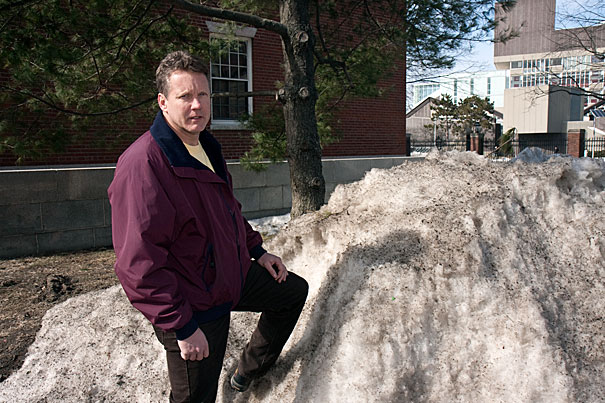It’s his job to make sure everything runs smoothly when weather emergencies strike. He coordinates with faculty and building managers around campus, addressing complaints about fallen tree branches or icy walkways. He manages a fleet of seven Bobcats, two front-end loaders, and 12 plowing trucks. And in winters like this one, he calls in 18-wheelers to transport huge piles of snow to Harvard’s vacant lots in Allston.