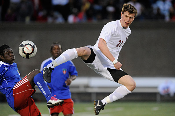Crimson defender Tim Linden ’11 (left) vies for the ball with his Haiti opponent.