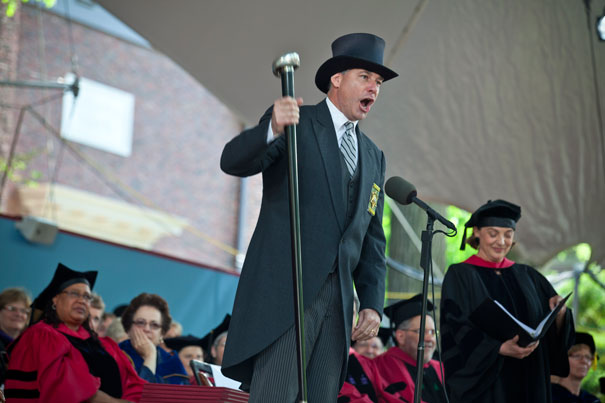Middlesex County Sheriff Peter Koutoujian had big shoes to fill. His predecessor, James DiPaola, had called Commencement to order from 1997 until his sudden death last November. This year, Koutoujian took up the tradition, which dates to the 17th century. Standing at the front of the Commencement platform in a silk top hat, he struck the ground three times with a silver-tipped staff and intoned, “The high sheriff of Middlesex County now declares that the meeting will be … in ooorder!”