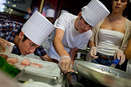 As their audience of classmates noshed on salad bar fare and macaroni and cheese, four teams of five students whipped up entrées in just under an hour, using nothing more than fresh local produce, small fuel burners, dining hall pans, and a surprising amount of ingenuity.