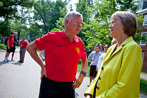 On a brief walk through the Yard, Faust noted points of interest to the team’s manager Sir Alex Ferguson, including the site of the archaeological dig involving the Indian College, Harvard Yard’s first brick building, and Harvard’s oldest building: Massachusetts Hall.