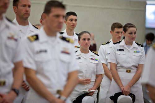 Watching the ceremony at Hilles, dressed in crisp whites, were all nine Navy ROTC midshipmen enrolled at Harvard College. If they had one message it was to thank all the ROTC cadets and midshipmen before them, who laid the groundwork for bringing a formal ROTC presence back to Harvard.