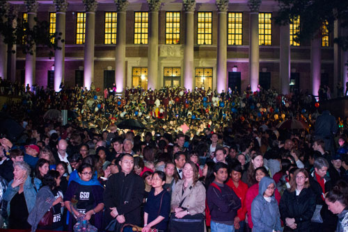 In her remarks, Faust delivered the birthday wishes. She had three: that Harvard create a future that graduates of the past would be proud of; that people at Harvard work together to serve the University’s greatest goals, “to teach, to learn, to expand the realms of knowledge”; and that Harvard continue to be committed “to open access and inquiry.”