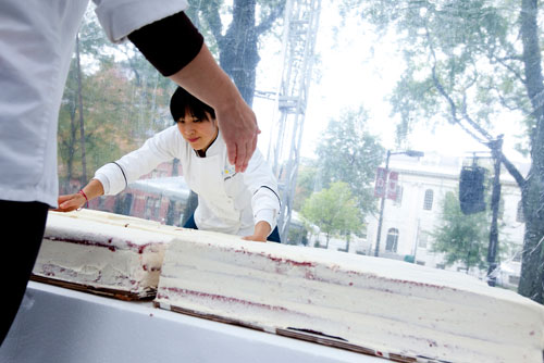 The three-layer, red velvet cake, topped with butter cream frosting, was the result of months of labor for Joanne Chang ’91, owner of Flour Bakery + Café. Chang and her staff put together the cake, moving the pieces bucket-brigade style while Richard Spingel, production manager for HUHDS, handed them out of the back of the truck.