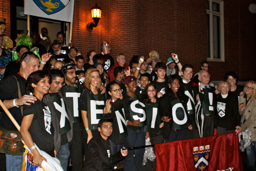 Harvard Extension Student Association (HESA) President Philip Harding (who created the official Harvard 375th promotional video) led an enthusiastic Extension School parade contingent through Harvard Square. Their parade contribution culminated in a video “interruption” played on the Jumbotrons around Tercentenary Theatre. The lettered T-shirts of nine of the participants spelled out Extension with punctuation provided by Dean Michael Shinagel and his wife, Marjorie North, in the form of two exclamation-marked T-shirts.