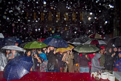 As the rain fell Friday night, many anniversary celebrants remained in Tercentenary Theatre, clustered in humid knots huddled under their umbrellas. The water fell in gray sheets, as from a waterfall. The lawn turned into a sliding sea of mud. Along sidewalks, the puddles flowed into brown streams.