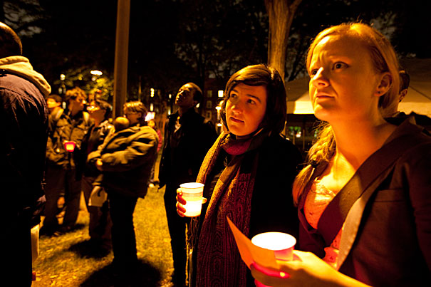 The event, organized by the group Queer Students and Allies (QSA), began at Sever Hall and concluded with a candlelight vigil on the steps of University Hall that both honored the recent progress toward equality for the BGLTQ (bisexual, gay, lesbian, transgender, and queer) community and the suffering many still face as a result of their sexuality.