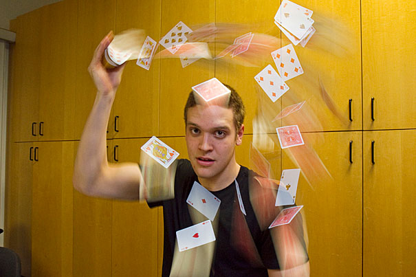 He presents his arm — not a typical next step in magic. “Squeeze my wrist hard,” he commands. “Think about the number or face of your card.”