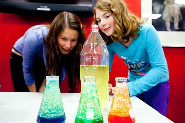 Michelle Sirois ’12, a biology major, worked with Julia Weeks, 9, on a project titled “Clean Change,” where they cleaned pennies with acid-based sauce.