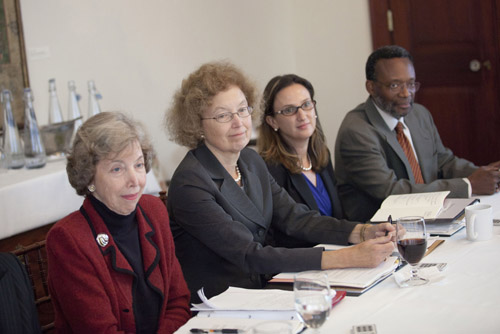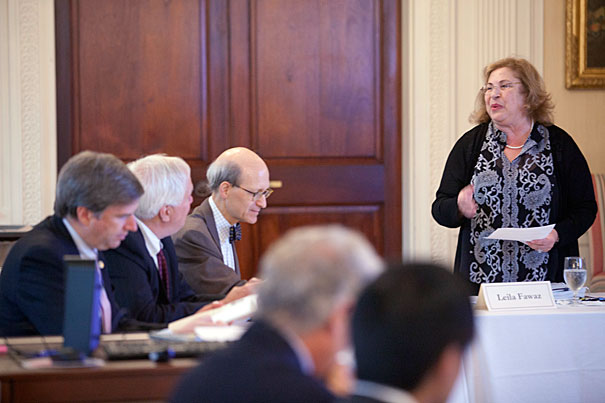 Harvard Board of Overseers president Leila Fawaz (standing), Issam M. Fares Professor of Lebanese and Eastern Mediterranean Studies at Tufts University, speaks to the board at a recent meeting at Loeb House in Cambridge. Seated (from left) are fellow Overseers Cristián Samper, director of the Smithsonian’s National Museum of Natural History, Richard Meserve, president of the Carnegie Institution for Science, and Robert Shapiro, partner at the law firm Ropes & Gray.