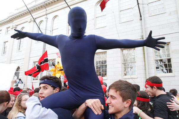 Formal-looking gentlemen — resplendent in ensembles of top hats, bow ties, and Bermuda shorts — shouted barbs at impervious runners, who sported nothing but green Speedos as they took an anticipatory victory lap around Harvard Yard. A determined moose swung a mock punch at a defiant red fish. Taunts and jeers flew fast and furious between mobs of students who trumpeted vuvuzelas, smashed cymbals, and banged cheering sticks together.