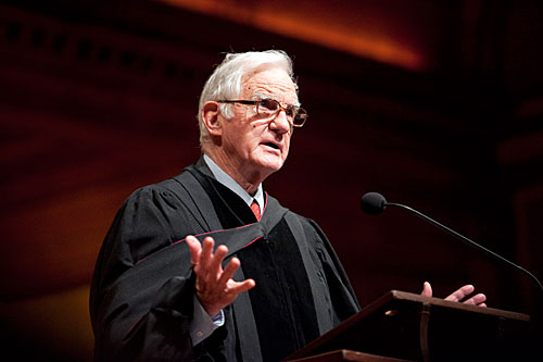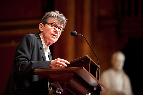 Both brevity and wit came in the person of PBK poet Kay Ryan, winner of the 2011 Pulitzer Prize, whose poems are typically distilled to 20 lines or fewer — “packed,” said one critic, “with music and meaning.” The two-time Poet Laureate of the United States wished out loud that she could have become a different poet before the ceremony — “somebody more long-winded,” perhaps, as befitting the occasion. Instead, she strung together 12 of her compact poems “into something I will call a graduation garland.”