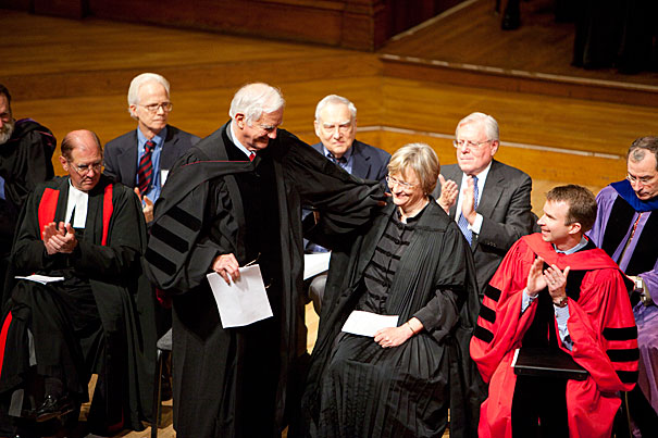 Former Harvard president Derek Bok greets current president Drew Faust at the Phi Beta Kappa Exercises inside Sanders Theatre. Two-time Poet Laureate of the United States and 2011 Pulitzer Prize winner Kay Ryan (not pictured) read 12 poems at the ceremony.