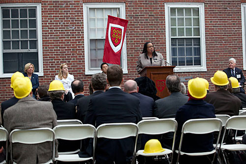 Deborah Gehrke, co-master of Quincy House (from left), Catherine Katz ’13, Scott Yim ’13, Dean of Harvard College Evelynn M. Hammonds (podium), and Lee Gehrke, co-master of Quincy House, during the groundbreaking ceremony.