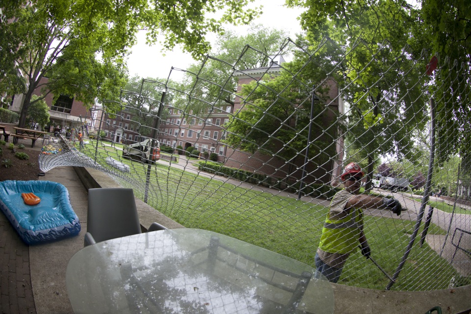 Emma Lipshultz `15 (left) moves into swing housing inside Ridgley Hall on Massachusetts Ave. with the help of her brother, Zack, and her mother, Tracy Miller. Immediately after Harvard’s Commencement, fencing for the Old Quincy House renovation was installed. School time and the living is easy! Emma Lipshultz `15 outfits her room in Ridgley Hall with a beanbag couch. Inside Hampden Hall, Wendy Chen `14 (left) sorts through clothes with friend Michelle Timmerman `13, who lives next door in Adams House. Movers assist Edith Chan `12-`13 in moving into her new home: Fairfax Hall. Matt Tufano `13 (from left), Scott Yim `13, and Christine Hughes `13 set up sound equipment for a Quincy House welcome-back barbecue. The façade of Fairfax Hall swing housing is bedecked with balloons. Luchen Wang `14 lounges in front of a student mural depicting Quincy House and the Weeks Bridge in the basement of Old Quincy prior to renovations. Framed by the doorway to his bathroom, Luchen Wang `14 studies in his Old Quincy House dorm before the renovation. Wang’s roommate had to pass through Wang’s room to get to the bathroom and Wang needed to pass through his roommate’s room to leave the dorm. The new configuration is more spacious and provides more privacy. Kyle McIntee `15, (from left), Chuck Katis `15, and Matt Karle `15, who are now living in adjacent rooms in Fairfax Hall swing housing, reunite after the summer. Total eclipse: A student moves from Old Quincy House into swing housing.