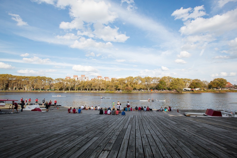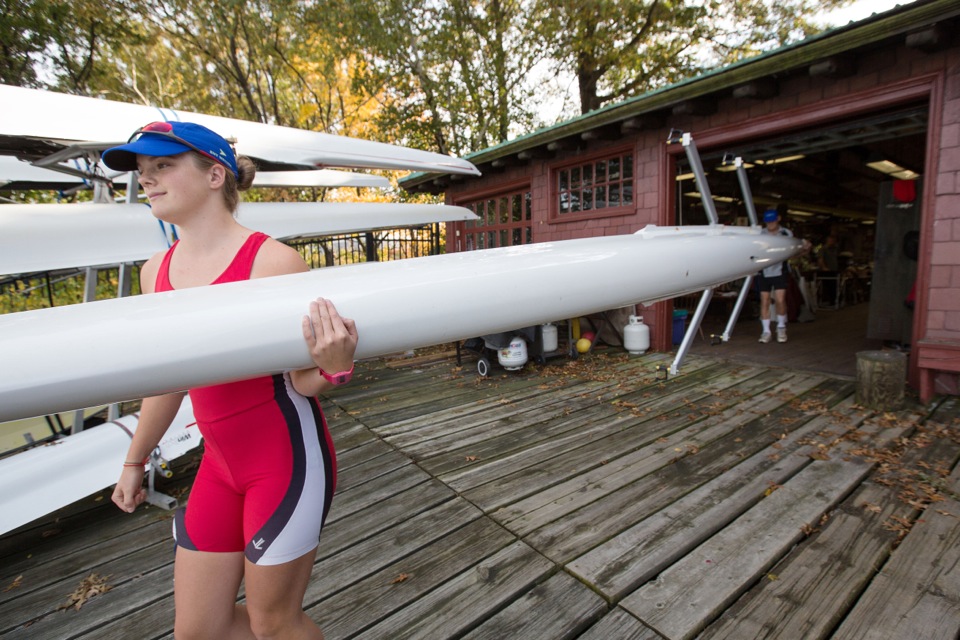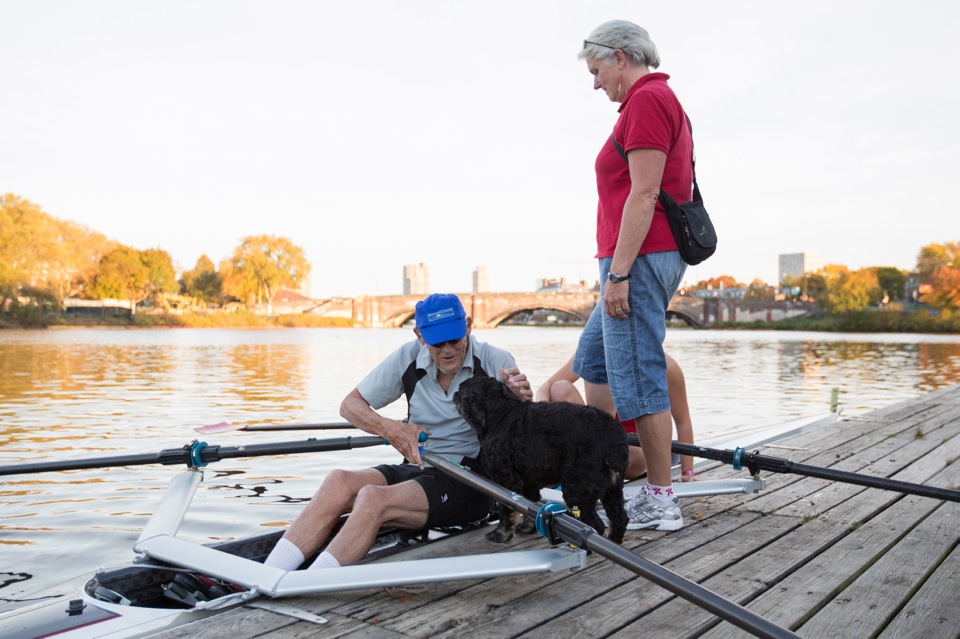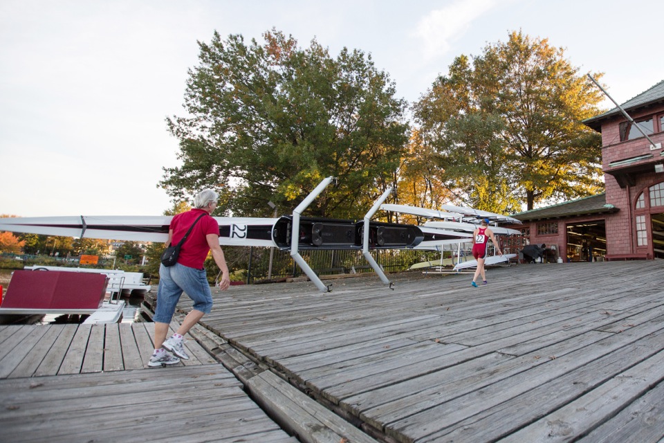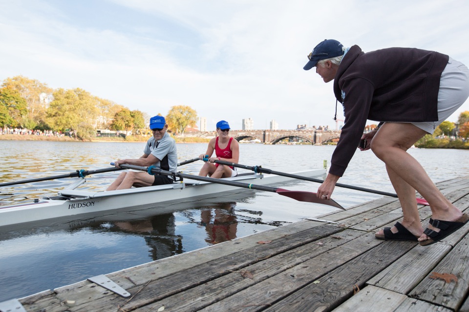 Spectators watch the Head of the Charles Regatta from the Newell Boat House dock. Harvard competed in a majority of the races on both days of the event, with participation by students, parents, alumni, and staff. Winsor School student Abigail Parker and her father, Harry Parker, head coach of the Harvard men’s heavyweight crew, bring their boat out of Newell Boat House. The duo participated in a Directors’ Challenge doubles race composed of parent-child teams. Harry Parker and daughter Abigail (back left) prepare to launch their boat. Kerry Herman pushes the two off into the Charles River. Father and daughter (right boat) make their way to the starting line before the race. The pair rows in unison under the Anderson Memorial Bridge. They give it the old heave-ho, racing past spectators sprawled along the Charles on a springlike October day. After the race, they row back to the Newell Boat House. The pair placed 21st overall. Parker’s wife, Kathryn Keeler, arrives with the duo’s biggest supporter yet — the family pet. Kathryn Keeler assists daughter Abigail with loading the boat back into the boathouse. They grow up so fast, don’t they?