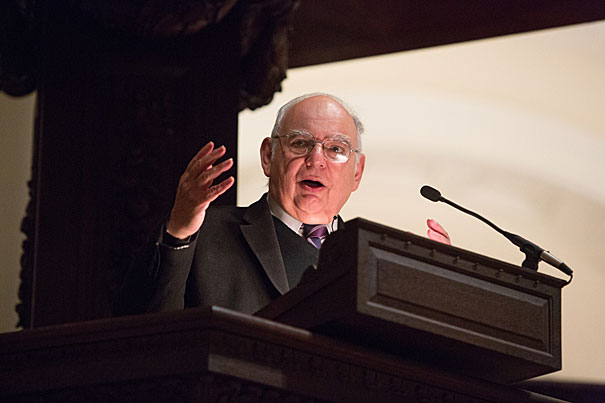 Ernesto Cortés Jr. received the Robert Coles “Call of Service” Award for his efforts to empower people to improve their lives and circumstances. After receiving his award, Cortés climbed up to the Memorial Church’s grand pulpit, 15 feet above the audience, to deliver his lecture. “I feel like I’m in ‘Moby Dick,’” he chuckled.