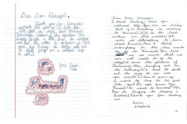 A few times each semester, the dean writes a letter to McAvoy’s class and tells them about things that are happening in his life — both professional and personal — such as his travels abroad, important people he has met, special events on the Harvard campus, or the antics of his dog, Quincy. Each letter gives McAvoy topics to incorporate into her lesson plans and an opportunity for the students to practice their writing, spelling, and handwriting when they write back. In his letters, Shinagel encourages their writing and comments on improvements he’s observed.
