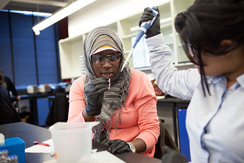 The group of about 15 students carefully followed steps outlined on the blackboard by research assistant Alia Qatarneh. In the process, they completed the Amgen-Bruce Wallace Biotechnology Lab Program, an eight-lab biotechnology course supported by the Harvard Life Sciences Outreach Program and funded by the Amgen Foundation.