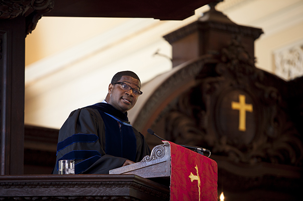 Jonathan L. Walton, Plummer Professor of Christian Morals and Pusey Minister at Harvard’s Memorial Church, is pictured here at a Sunday service in September.