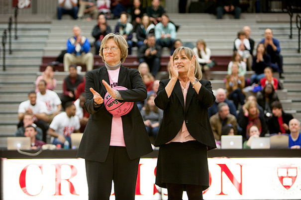 President Drew Faust (left) was presented with a pink basketball by fellow cancer survivor and women’s basketball coach Kathy Delaney-Smith in honor of the Pink Zone, a special event that supports the fight against breast cancer.