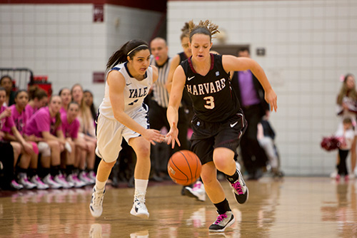 Harvard’s Lavietes Pavilion was bedecked in a paler shade of crimson on Saturday for the Harvard-Yale women’s basketball game.