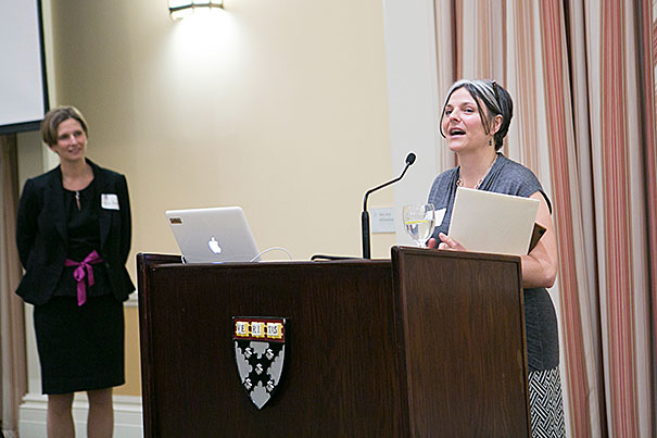 “When the [Gardner Pilot Academy] says they serve the whole child, the whole community, they do,” said Lisa Moellman (right) after receiving the Champion Award. Gardner Principal Erica Herman (left) lauded Moellman’s contributions during her tenure as Harvard’s associate director of campus engagement and research in school.