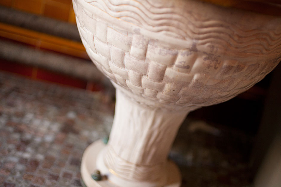 In 1891, the home’s second owner, Henry Clarke Warren, who was handicapped after injuring his spine as a child, outfitted his bathroom with special features such as a call bell and a two-tiered, zinc bathtub. The reclusive Warren lived on the second floor, where he installed other call bells, skylights, a heated sunporch, and a specially designed bed. He heated his rooms to 90 degrees as a respite from his chronic pain. Despite his lifelong suffering, Warren attained distinction in his field with his pioneering research in Sanskrit and Pali texts. He worked standing — with the aid of crutches — but eventually this became impossible so he worked kneeling on a chair, supporting his weight by leaning on his elbows. Warren’s great friend Charles Lanman, a Sanskrit professor at Harvard, once joked with Warren about the latter’s “trouser knees,” which were frayed from his constant kneeling. Warren answered, “Ah, but when St. Peter sees those knees, he’ll say, ‘Pass right in, sir, pass right in.’”