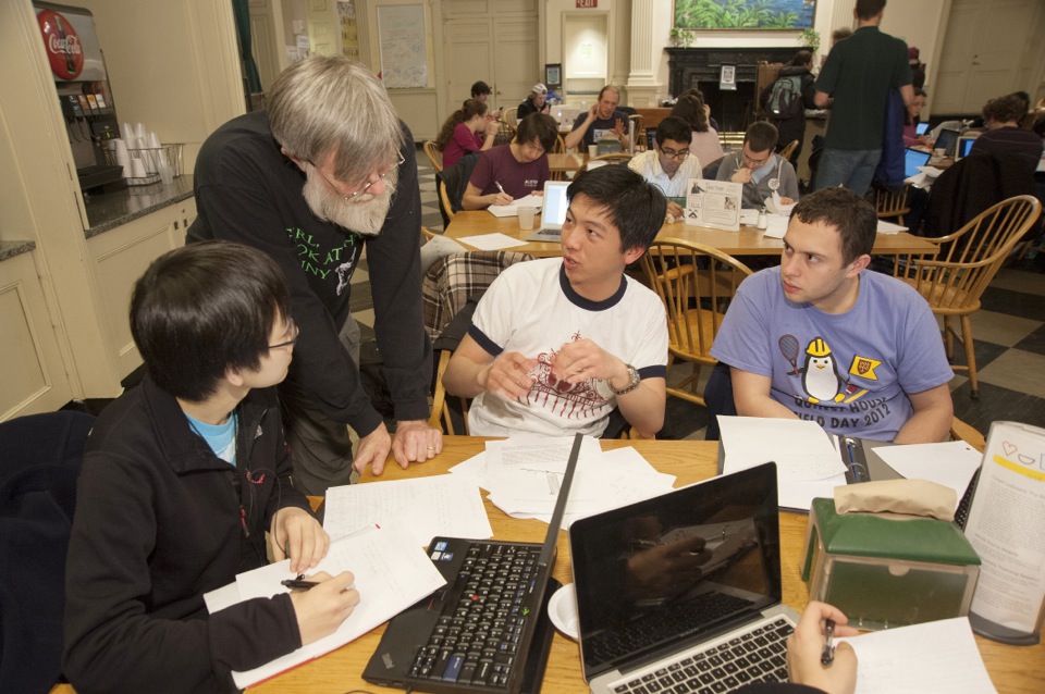 Howard Georgi, Mallinckrodt Professor of Physics, said Physics Night started in 1998 when three things coincided: He became master of Leverett; the dining halls were opened for study during off hours; and problem sets in several physics classes were due on Thursday mornings. The confluence meant that many students began working long into Wednesday nights, and Georgi was there to help.