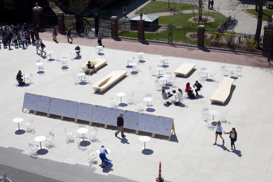 The students joined with the Harvard Common Spaces Program, which had been planning a commemoration on the revitalized plaza. Armed with the students’ idea, Harvard staff constructed the boards and placed 3,000 flowers throughout the plaza and in other common spaces for passersby to take home.