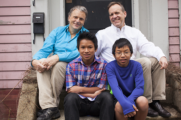 This year, thanks to a change in Harvard policy, same-sex married couples won’t have to pay additional federal taxes on their health coverage. “I was touched,” said Kevin Patton-Hock (clockwise from left), a full-time parent to his and husband Arthur Patton-Hock’s two sons, Chet and Mao. “I thought it was really nice, and just a beautiful thing to see everyone treated the same.” Arthur has worked for Harvard for more than 27 years.