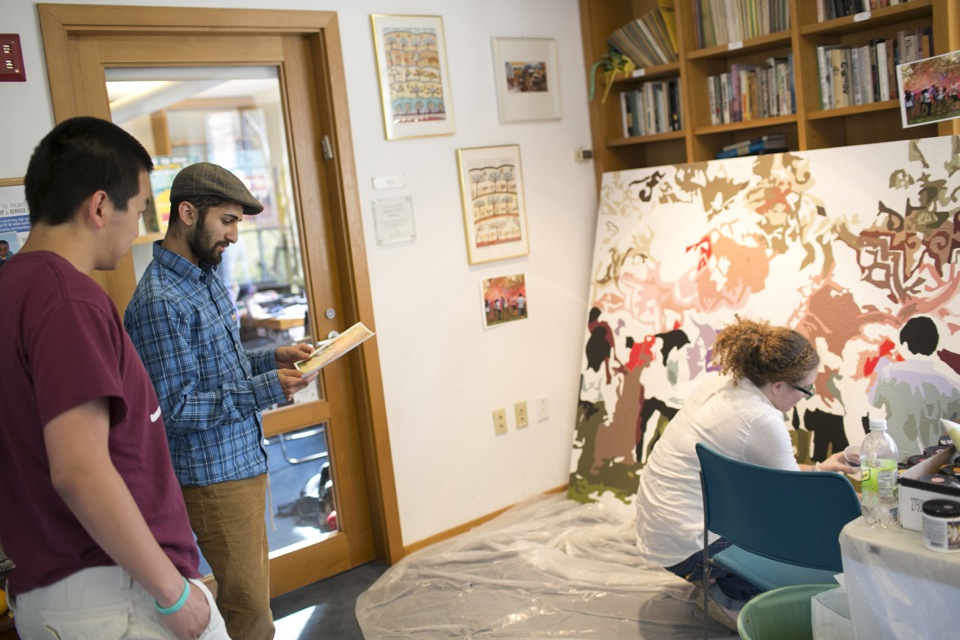 With the support of Harvard Hillel, Harvard Memorial Church, the Harvard Chaplains, and Combined Jewish Philanthropies in Boston, Gilon and a number of Harvard students were able to devote a week to painting the mural. Gilon helped students mix paint and showed them where to apply it to the mural whose outline she had stenciled ahead of time. Some students were artists; others just wanted the chance to spend time in the group. There was a relaxed atmosphere and lighthearted chatter among people meeting each other for the first time.