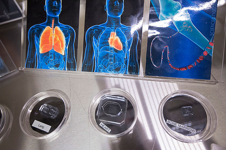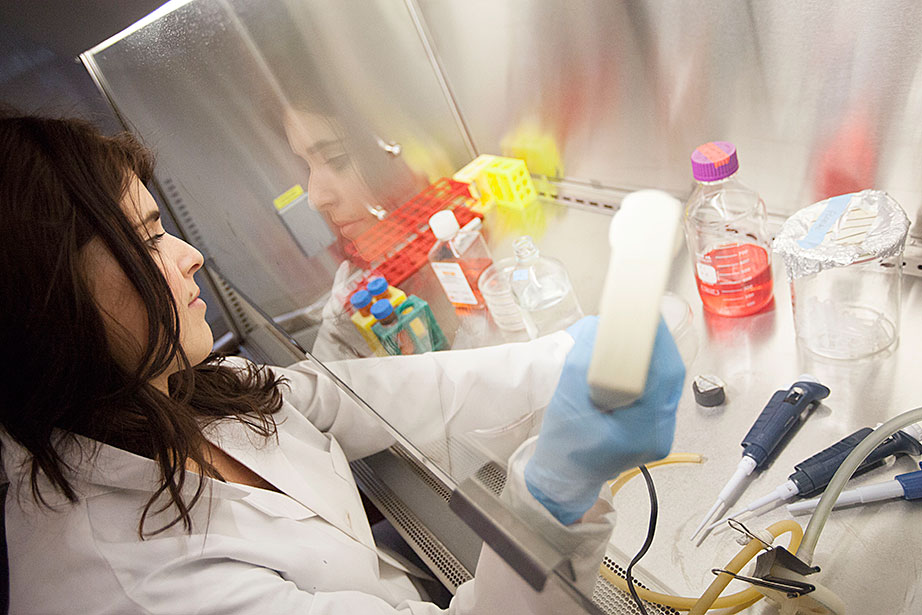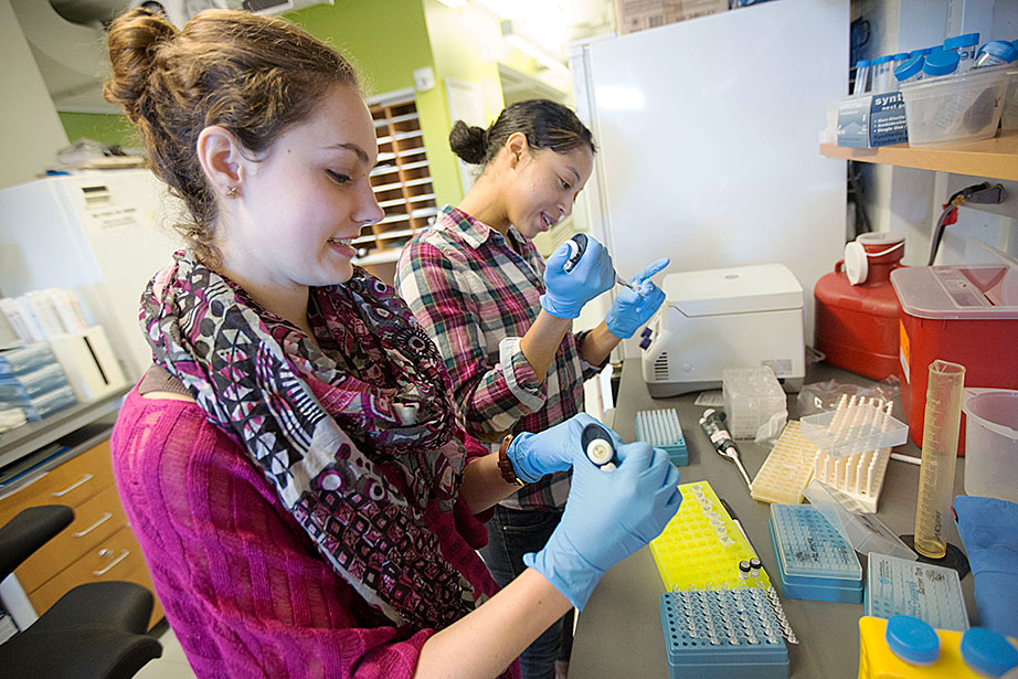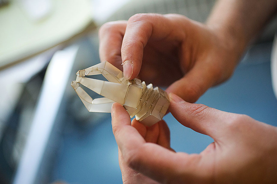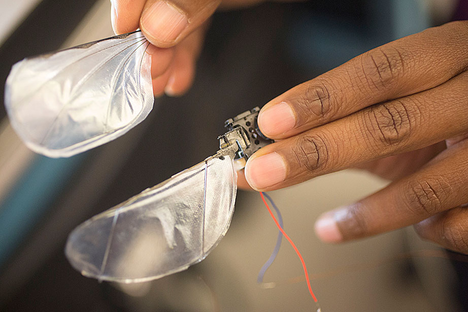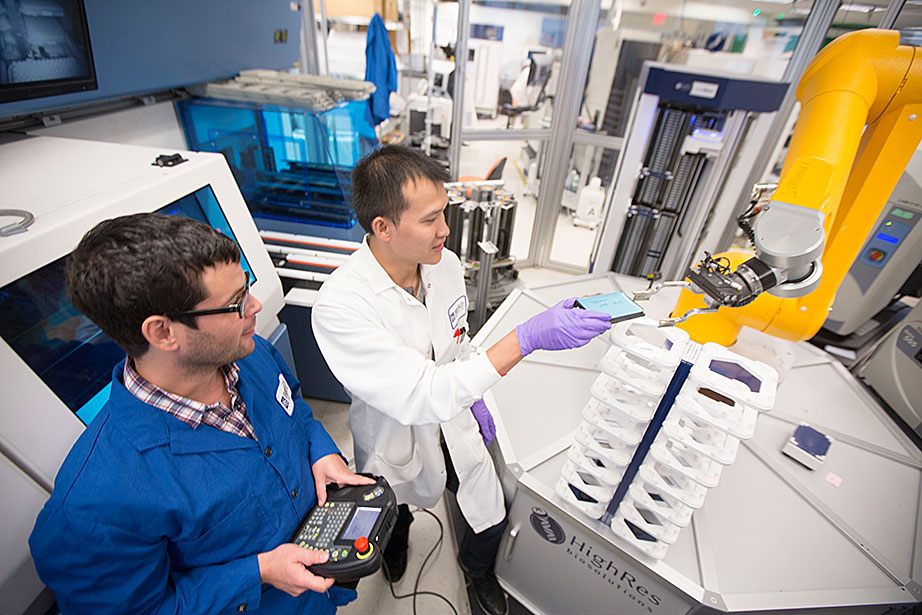 Marissa Suchyta ’14 (left) and graduate student Alana Van Dervort study salamander regeneration in a lab at the Harvard Stem Cell Institute. Belinda von Niederhaeusern, a former fellow in stem cell and regenerative biology, works in the Sherman Fairchild Building, which is LEED Platinum certified. Through the Harvard Green Labs Initiative, Harvard is committed to reducing energy and conserving resources in laboratories. Florian Block (from left, in reflection), a research associate in computer science, Chia Shen, a senior research fellow in computer science, and Xi Chen, a visiting scholar in computer science, use an interactive software called FloTree, which offers Harvard Museum of Natural History visitors the opportunity to use their hands as barriers to separate virtual populations of organisms. Graduate students Kevin Ma and Pakpong Chirarattananon perform a pre-flight lab inspection of the RoboBee (framed by an orchid) at the Harvard Microrobotics Laboratory. Slava Arabagi works on soft sensor fabrication at the Harvard Microrobotics Laboratory. Postdoctoral researcher Mike Wehner reflected in a molding of soft robot materials made in the Harvard Microrobotics Lab. Michael Tolley (right), postdoctoral fellow in materials science and mechanical engineering in the Wyss Institute, seen here with lab manager Michael Smith, holds a large-scale model of the Harvard Monolithic Bee — a robot insect that is actually the size of a quarter. Michael Tolley works with an origami-inspired gripper folded from a single plastic sheet in the Harvard Microrobotics Lab. Views of mural artwork dappled with natural light in the modern spaces of the Harvard Microrobotics Lab. Ranjana Sahai, research associate in materials science and mechanical engineering, assembles robotic insect wings inside the Harvard Microrobotics Lab. Harvard Microrobotics Lab Manager Michael Smith works on a Denton sputtering chamber for disposition of thin metal onto various surfaces and materials. Zamyla Chan ’14 (from left), postdoctoral fellow in chemistry and chemical biology Christopher Gagliardi, and chemistry and chemical biology research assistant Robert Halbach work in Harvard’s Nocera Lab. Many experiments run in this lab require the rigors of oxygen and water at the level of “parts per billion,” or at even lower ratios. To perform them, students must have expertise in manipulating compounds and solutions under high-vacuum manifolds. Graduate student Andrew Ullman performs research in the Nocera Lab. Graduate student Daniel Bediako (left) and Zamyla Chan ’14 cut a silicone sample in the Nocera Lab. Visiting graduate student Anne Louise Kodal works in the laboratory of Will Shih, associate professor of biological chemistry and molecular pharmacology at the Wyss Institute. The Shih Lab explores design principles for self-assembling molecular machines. Staff engineer-mechanical Stacey Fitzgibbons (from left), and electrical staff engineers Amanda Wozniak and Crystal Knodel test a medical device developed at the Wyss Institute for treating infant apnea. On the table is a plastic infant used for calibrating the equipment. Senior staff scientist Daniel Levner displays research materials and illustrations for the organs-on-chips project at the Wyss Institute. Senior staff scientist Daniel Levner manipulates a robot used for research while working on the organs-on-chips project at the Wyss Institute. Broad Institute automation engineer Christian Soule (left) and research associate Hoang Danh perform high-throughput screening and compound management investigating cancer, infectious diseases, pesticide, and bacteria. Cassandra Elie and Kevin Joseph, both process development associates, perform whole genome sample sequencing inside the Broad Institute.