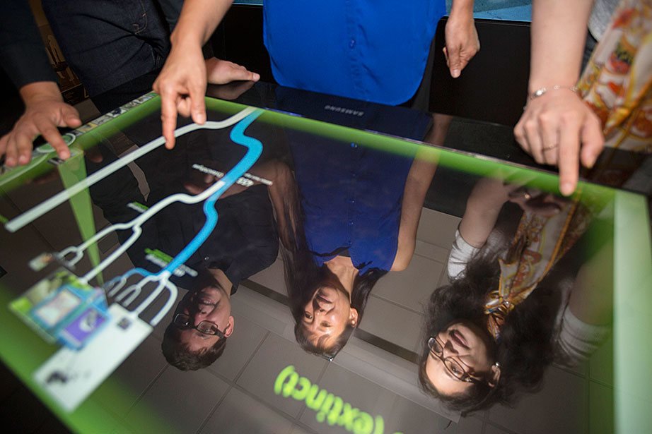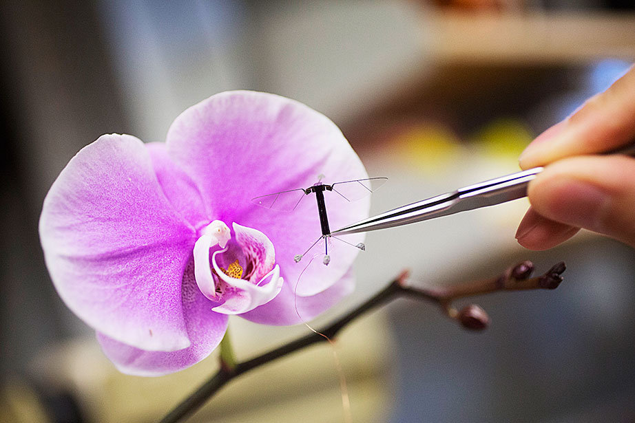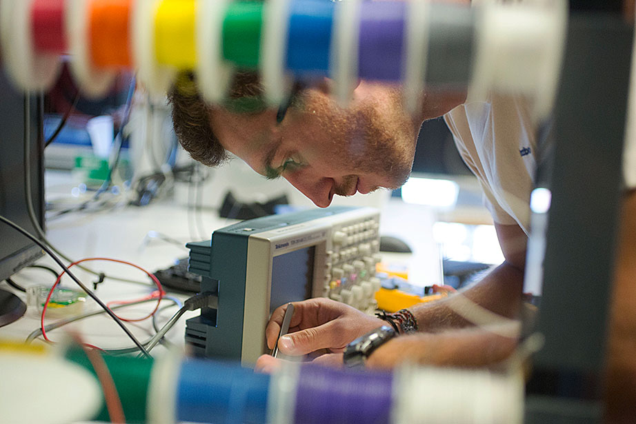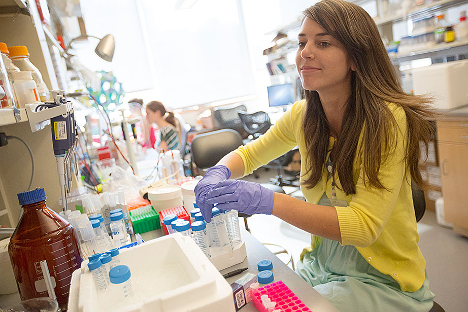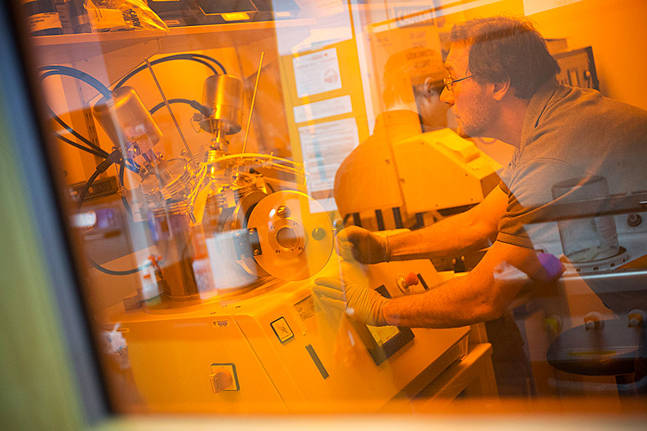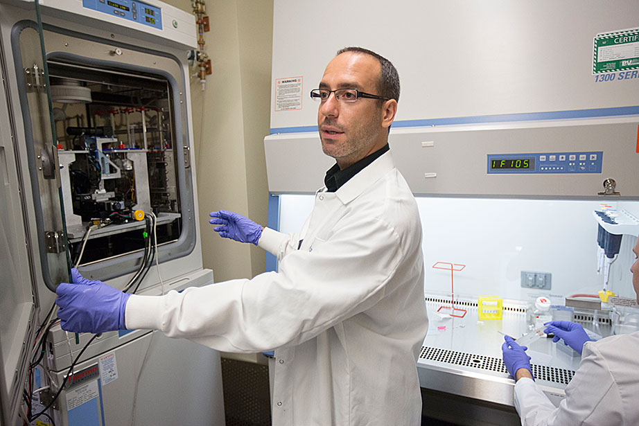 Marissa Suchyta ’14 (left) and graduate student Alana Van Dervort study salamander regeneration in a lab at the Harvard Stem Cell Institute. Belinda von Niederhaeusern, a former fellow in stem cell and regenerative biology, works in the Sherman Fairchild Building, which is LEED Platinum certified. Through the Harvard Green Labs Initiative, Harvard is committed to reducing energy and conserving resources in laboratories. Florian Block (from left, in reflection), a research associate in computer science, Chia Shen, a senior research fellow in computer science, and Xi Chen, a visiting scholar in computer science, use an interactive software called FloTree, which offers Harvard Museum of Natural History visitors the opportunity to use their hands as barriers to separate virtual populations of organisms. Graduate students Kevin Ma and Pakpong Chirarattananon perform a pre-flight lab inspection of the RoboBee (framed by an orchid) at the Harvard Microrobotics Laboratory. Slava Arabagi works on soft sensor fabrication at the Harvard Microrobotics Laboratory. Postdoctoral researcher Mike Wehner reflected in a molding of soft robot materials made in the Harvard Microrobotics Lab. Michael Tolley (right), postdoctoral fellow in materials science and mechanical engineering in the Wyss Institute, seen here with lab manager Michael Smith, holds a large-scale model of the Harvard Monolithic Bee — a robot insect that is actually the size of a quarter. Michael Tolley works with an origami-inspired gripper folded from a single plastic sheet in the Harvard Microrobotics Lab. Views of mural artwork dappled with natural light in the modern spaces of the Harvard Microrobotics Lab. Ranjana Sahai, research associate in materials science and mechanical engineering, assembles robotic insect wings inside the Harvard Microrobotics Lab. Harvard Microrobotics Lab Manager Michael Smith works on a Denton sputtering chamber for disposition of thin metal onto various surfaces and materials. Zamyla Chan ’14 (from left), postdoctoral fellow in chemistry and chemical biology Christopher Gagliardi, and chemistry and chemical biology research assistant Robert Halbach work in Harvard’s Nocera Lab. Many experiments run in this lab require the rigors of oxygen and water at the level of “parts per billion,” or at even lower ratios. To perform them, students must have expertise in manipulating compounds and solutions under high-vacuum manifolds. Graduate student Andrew Ullman performs research in the Nocera Lab. Graduate student Daniel Bediako (left) and Zamyla Chan ’14 cut a silicone sample in the Nocera Lab. Visiting graduate student Anne Louise Kodal works in the laboratory of Will Shih, associate professor of biological chemistry and molecular pharmacology at the Wyss Institute. The Shih Lab explores design principles for self-assembling molecular machines. Staff engineer-mechanical Stacey Fitzgibbons (from left), and electrical staff engineers Amanda Wozniak and Crystal Knodel test a medical device developed at the Wyss Institute for treating infant apnea. On the table is a plastic infant used for calibrating the equipment. Senior staff scientist Daniel Levner displays research materials and illustrations for the organs-on-chips project at the Wyss Institute. Senior staff scientist Daniel Levner manipulates a robot used for research while working on the organs-on-chips project at the Wyss Institute. Broad Institute automation engineer Christian Soule (left) and research associate Hoang Danh perform high-throughput screening and compound management investigating cancer, infectious diseases, pesticide, and bacteria. Cassandra Elie and Kevin Joseph, both process development associates, perform whole genome sample sequencing inside the Broad Institute.