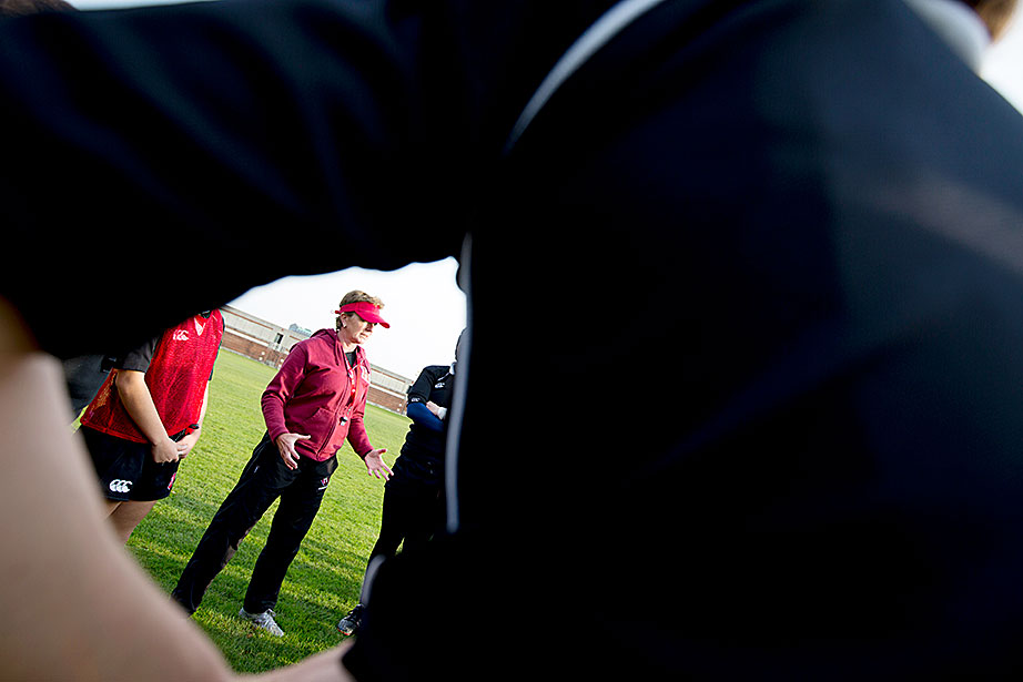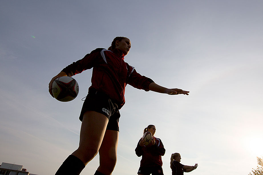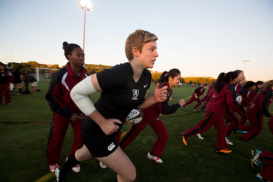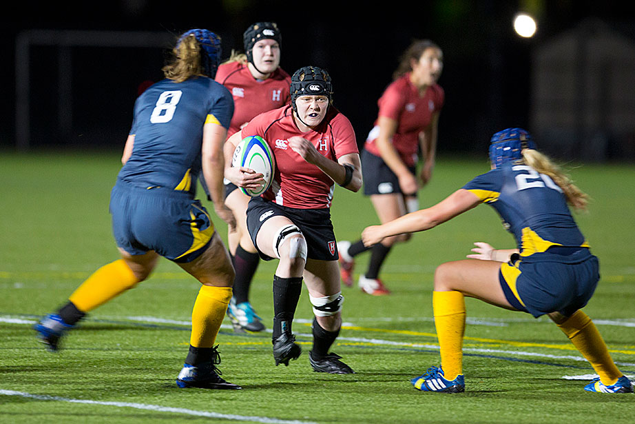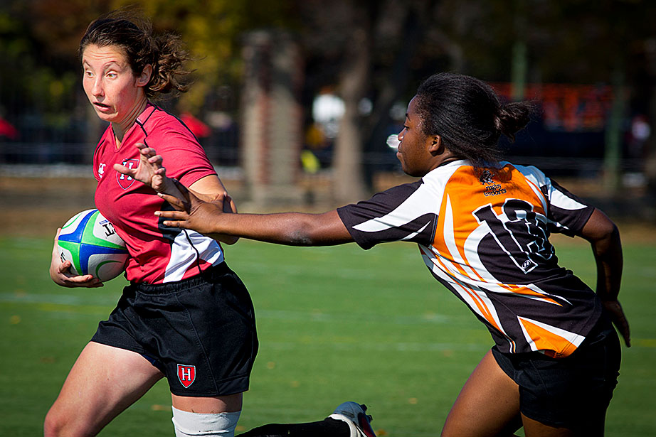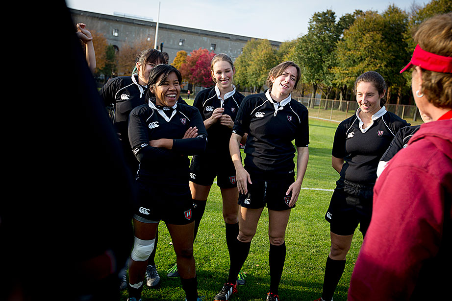 While the varsity status achieved by women’s rugby is important on Harvard’s campus, farther-reaching are the changes the players hope will come in the Ivy League and in women’s rugby on the national stage. Rugby will be played in the Olympics for the first time in 2016. Ball carrier Madison Singell gains yardage against Quinnipiac. Rugby is the only full-contact women’s sport at Harvard. Kellie Desrochers ’13 (left) and Jennifer Middleton ’10 cheer on their former club teammates, now varsity women. Harvard defenders Aniebiet Abasi (top) and Audrey Carson (bottom) take a down a Princeton player (with ball). Helen Clark passes an on-field concussion test administered by athletic trainer Corey Lanois during the Princeton game. Helmets are not required but some players wear them to protect against cauliflower ear, a complication resulting from ear injuries. Cayla Calderwood gets taken down by Princeton defenders. Kellie Desrochers ‘13 (from left), Marlee Morris ’12, and Meg McCarty ’12, an alumnae pack of former Harvard-Radcliffe ruggers, returned to watch their successors battle Princeton. Xanni Brown (left) evades a Princeton defender in a match. Harvard won, 36-0. Audrey Carson, foreground, and others work on passing techniques. Lenica Morales-Valenzuela (from left), Hope Schwartz, Ali Haber, and Xanni Brown react to coach Sue Parker’s practice plan. Head coach Sue Parker brought extensive experience to Harvard, including most recently serving as the coach for Navy. Assistant coach Sue Whitwell observes the underside mechanics of the scrum. Brandy Machado grips Rachael Stein’s legs during a scrum technique drill. Aniebiet Abasi (left) and Kaleigh Henry focus on improving strength in a pushing drill. Helen Clark works on her catching technique in practice. Rachael Stein (forefront) and teammates warm up before playing Quinnipiac in their first match as a varsity squad.