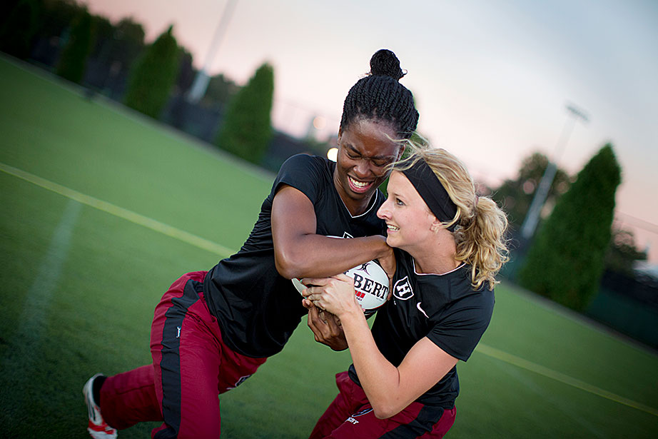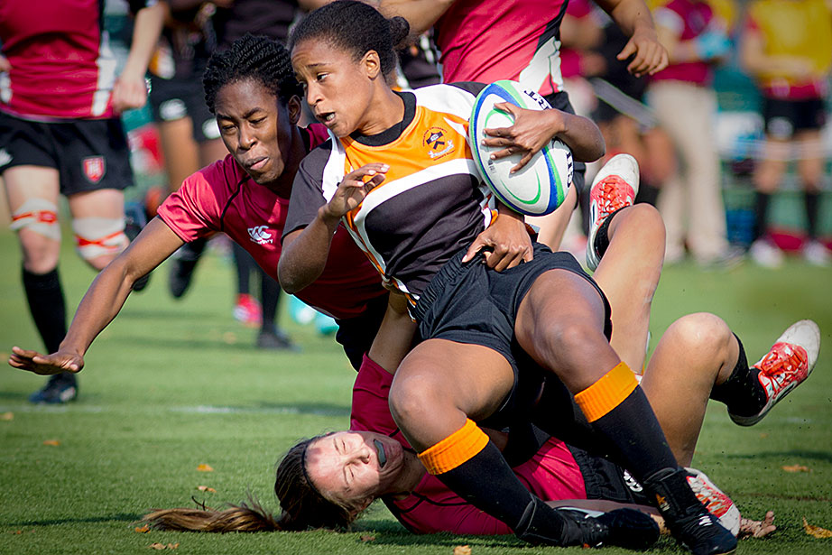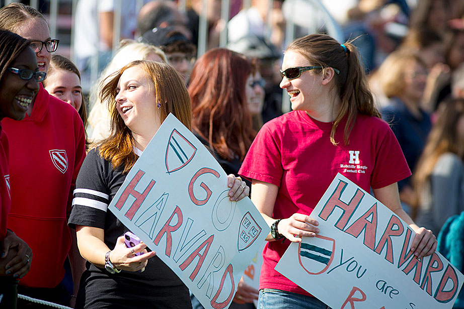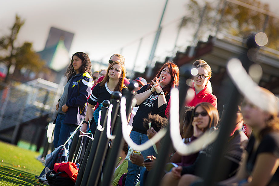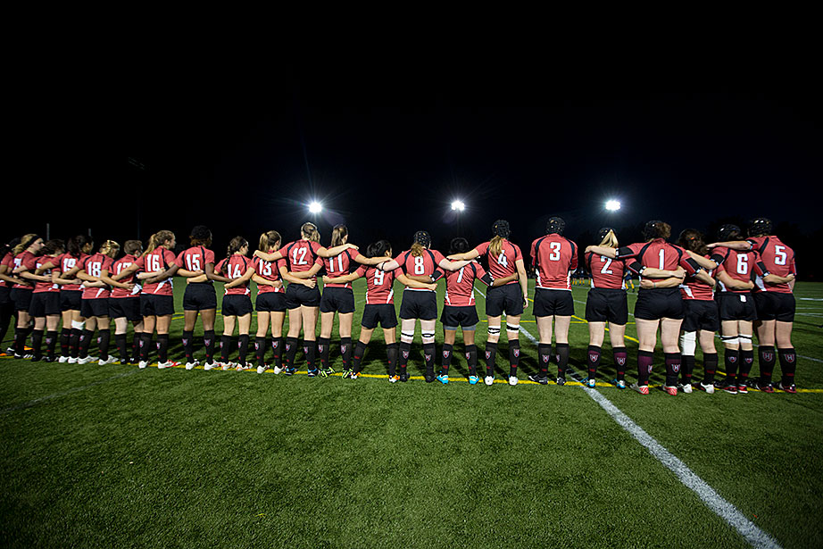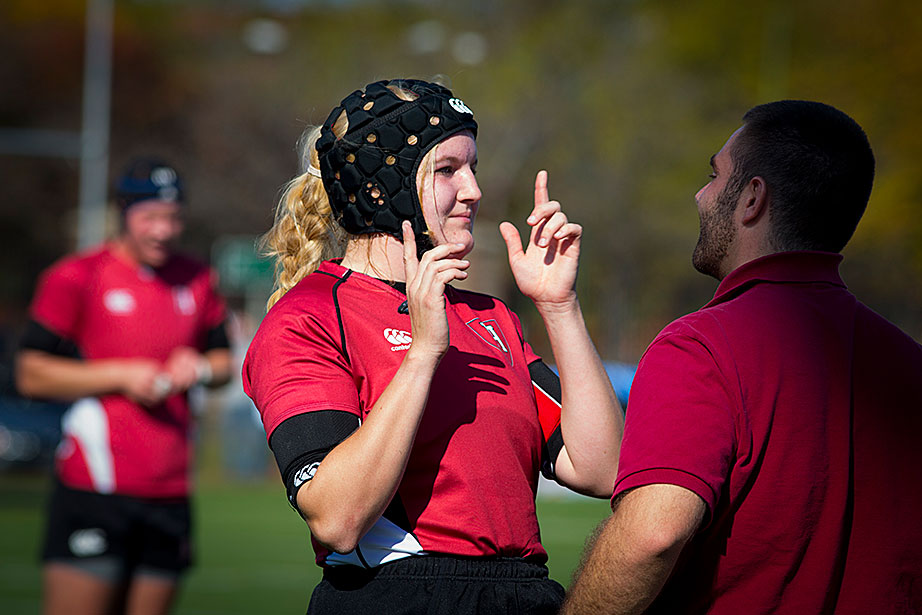 While the varsity status achieved by women’s rugby is important on Harvard’s campus, farther-reaching are the changes the players hope will come in the Ivy League and in women’s rugby on the national stage. Rugby will be played in the Olympics for the first time in 2016. Ball carrier Madison Singell gains yardage against Quinnipiac. Rugby is the only full-contact women’s sport at Harvard. Kellie Desrochers ’13 (left) and Jennifer Middleton ’10 cheer on their former club teammates, now varsity women. Harvard defenders Aniebiet Abasi (top) and Audrey Carson (bottom) take a down a Princeton player (with ball). Helen Clark passes an on-field concussion test administered by athletic trainer Corey Lanois during the Princeton game. Helmets are not required but some players wear them to protect against cauliflower ear, a complication resulting from ear injuries. Cayla Calderwood gets taken down by Princeton defenders. Kellie Desrochers ‘13 (from left), Marlee Morris ’12, and Meg McCarty ’12, an alumnae pack of former Harvard-Radcliffe ruggers, returned to watch their successors battle Princeton. Xanni Brown (left) evades a Princeton defender in a match. Harvard won, 36-0. Audrey Carson, foreground, and others work on passing techniques. Lenica Morales-Valenzuela (from left), Hope Schwartz, Ali Haber, and Xanni Brown react to coach Sue Parker’s practice plan. Head coach Sue Parker brought extensive experience to Harvard, including most recently serving as the coach for Navy. Assistant coach Sue Whitwell observes the underside mechanics of the scrum. Brandy Machado grips Rachael Stein’s legs during a scrum technique drill. Aniebiet Abasi (left) and Kaleigh Henry focus on improving strength in a pushing drill. Helen Clark works on her catching technique in practice. Rachael Stein (forefront) and teammates warm up before playing Quinnipiac in their first match as a varsity squad.