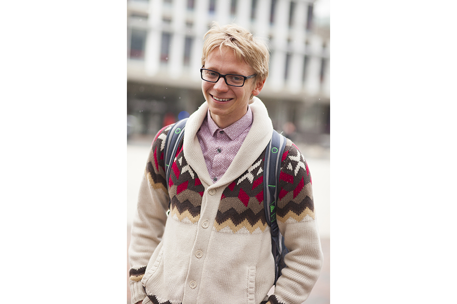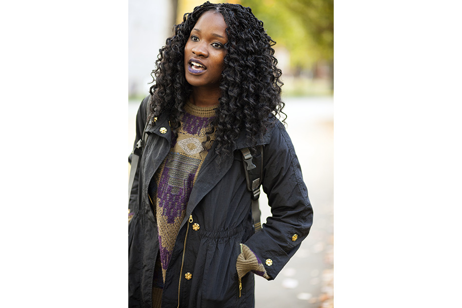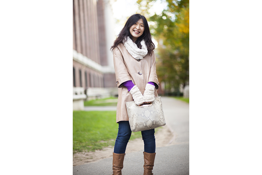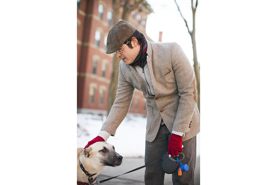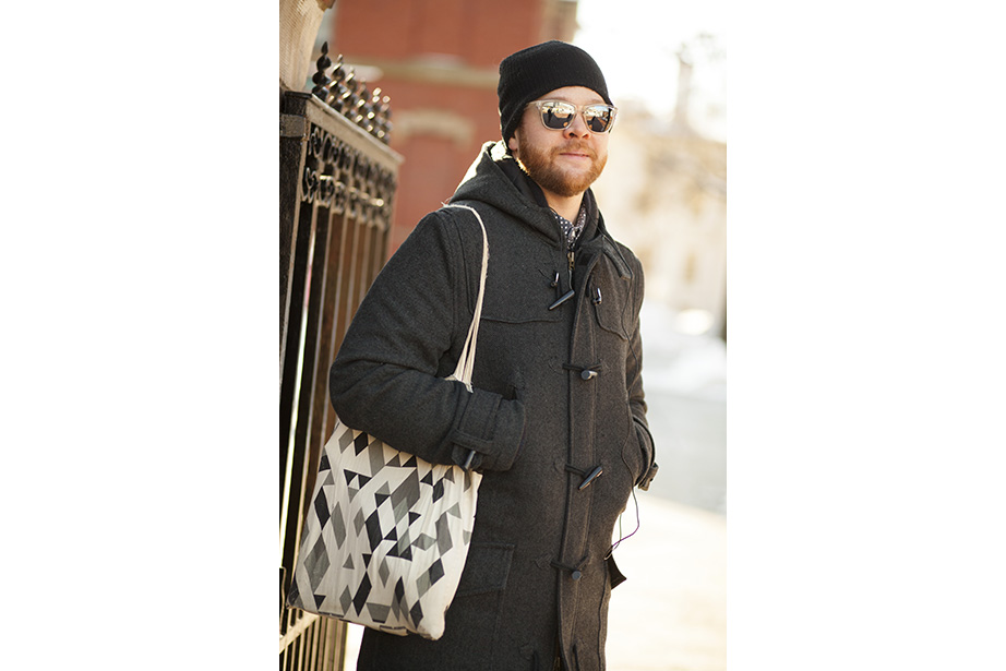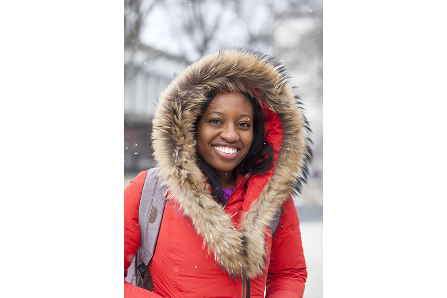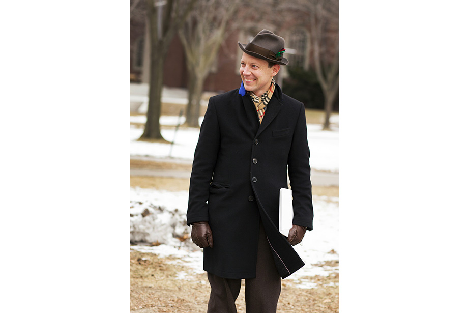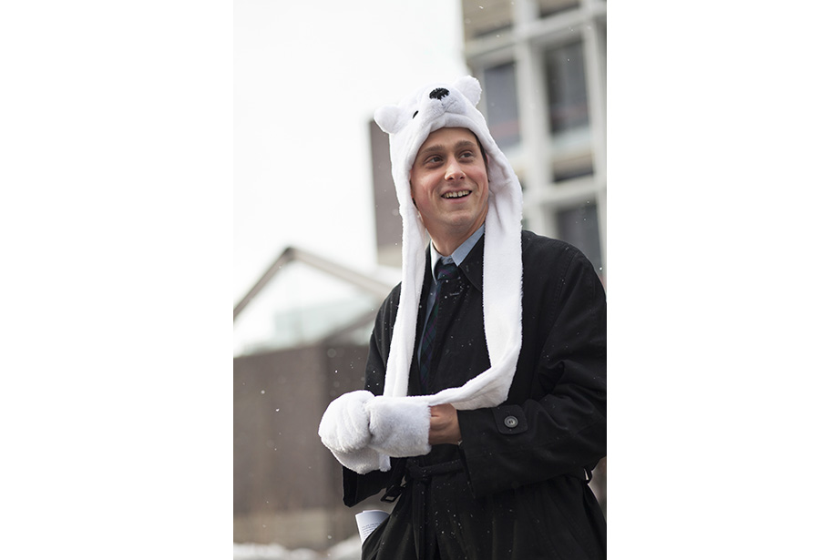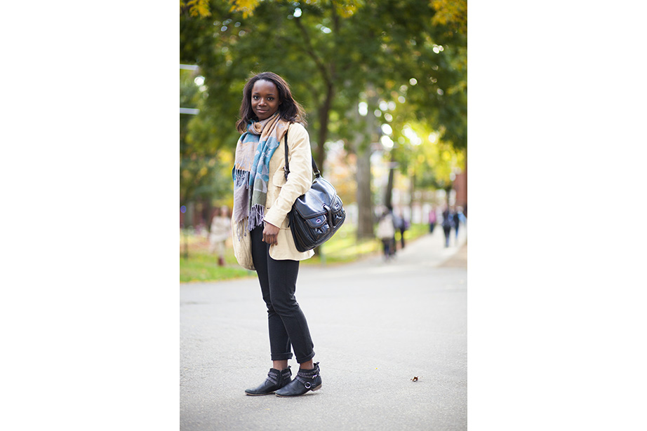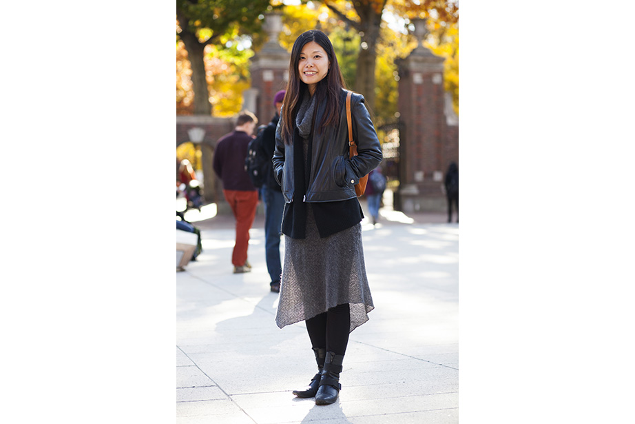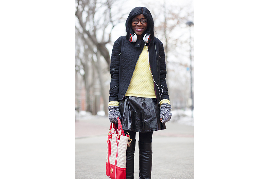 “This coat keeps me very warm,” remarked freshman Osaremen Okolo from Canton, Mass. “This is the worst winter we’ve had in a while. Usually there’s one big snowstorm. Now it’s like every day.” “I like wearing bow ties when they go with my outfit. I wear a variation of the same thing every day,” said Max Seawright, a graduate student in Romances languages and literatures. “I made this bow tie — I’ve probably made a couple dozen of them. This bag is from Brooklyn Flea — it has my swimming stuff in it. I’m coming from the gym.” Tony Rothman, a teaching assistant in general education, bought his hat from a market in Moscow, where he lived off and on for more than 15 years. “As they say in Russia, there’s no such thing as bad weather, just bad clothes.” And as for his head temperature: “It’s hot.” “I have to dress like a professional and not so sexy or fun,” said Tokyo native Ayumi Kanamoto, a visiting fellow at Harvard Kennedy School. “In Tokyo, everyone dresses very well. Here, people have a lot of passion and they’re interesting, but not so fashionable. I’m not even considered fashionable in Japan!” Linda Martini of Milan said Cambridge residents dress more casually than people in Italy. “People in Milan tend to dress up a lot,” she said. Matthew Sebastian, part of the A.R.T. stage crew, took his dog Sucuk (Turkish for “sausage”) out for a brisk morning walk. “I like the winter because I can layer. This is one of my favorite tweed jackets, it’s vintage.” But does he like the cold? “Oh, God no,” he guffawed. “It’s freezing.” He said he keeps warm with whiskey. Tobi Tikolo ’14 and Sophie Hagerty ’14 have been dating for two years. “We’re just really similar,” said Tikolo. Even their style is complementary: “I do wear a lot of masculine-inspired things. I like men’s shoes and men’s watches,” said Hagerty. “I have labs today — I’m an engineering student — so my wardrobe is very limiting. I have to wear trousers and flats,” said sophomore Yinka Ogunbiyi ’16. “I like items that don’t really make sense, like this sweater-coat-cardigan; it has a lot of hidden pockets.” “This is balmy to me. I’m from Minnesota!” said freshman Luke Heine. “My style is very esoteric. This sweater is a bit Vail, Colo. — skiing some mountains, hot-tubbing at night.” Before his visit back to Cambridge, alum Ellison Weeks, Ed.M ’11, who now lives in California’s Bay Area, went shopping. “I remembered how cold it was here, and I needed a new jacket, and I saw this one and loved the color and the camel wool. After coming to New England, my style is a bit preppier. I grew up a bit here.” Harvard Film Archive Director Haden Guest popped out in the cold to buy “Zama” by Antonio di Benedetto. “This is too cold for me!” said Louise Robin, an au pair from Corsica, France, and a student at Harvard Extension School. But she does embrace the snow while it’s here — she has several snow tubing and snowboarding trips planned. Joseph Wawrzyn of Somerville was passing through the Yard en route to work. “I’m nice and toasty, all layered up,” said Wawrzyn, who is the singer of Boston band Condor. He prefers winter to summer and said he keeps warm with, “Layers and snuggles.” “Yellow makes me happy and it’s so dreary. I wanted to cheer myself up,” said second-year Harvard Law School student Fatima Mohammed. “I lived in PfoHo as an undergraduate and our mascot is a polar bear,” said Brandon Geller, a sustainability manager at the Office for Sustainability and a graduate student at the Graduate School of Education. “I wear this regularly. It keeps my little paws warm.” “Harvard has better fashion in the fall. This is a men’s sweater I got from a thrift store. An oversized cardigan is my fall staple. It can make anything look great,” said Lami Olatunji ’14. “I’m wearing eyeliner on my lips and two-tone eye shadow.” “These are my usual colors for fall and winter. Not just dark, but I have a lot of layers and colors. Kind of like the changing leaves, you have to have a lot of shades of the same spectrum,” said Hong Kong native Janny Leung, a visiting scholar at the Yenching Institute.