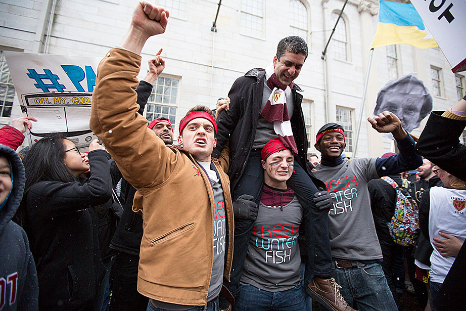 Cabot House Co-Master Rakesh Khurana, who is the incoming dean of the College, was hoisted into the air by some Cabot students.